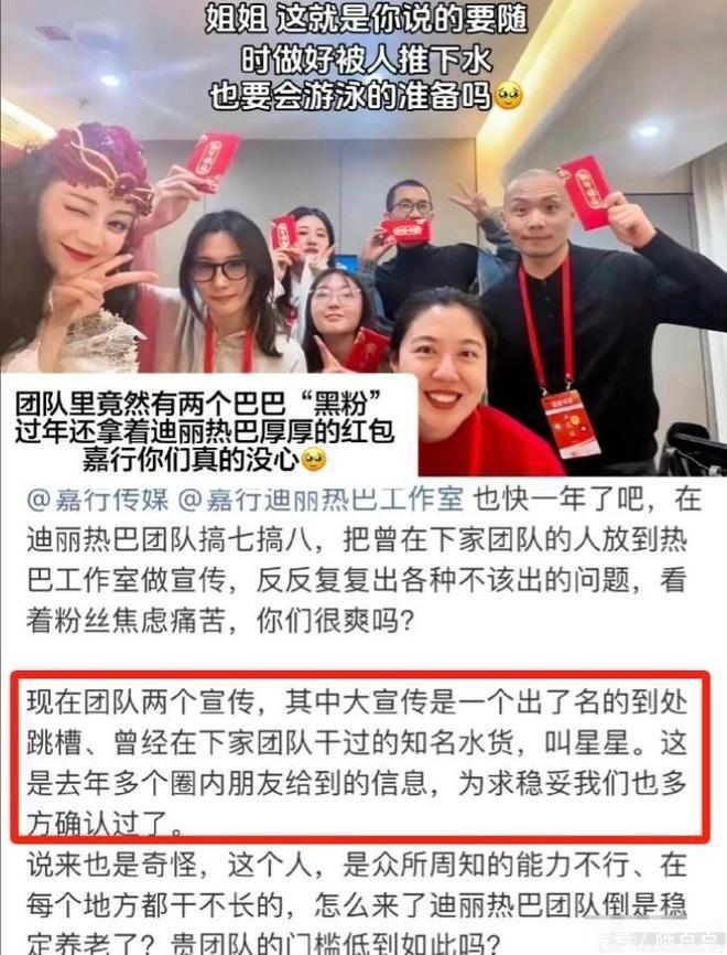 迪丽热巴作为全公司最大的摇钱树,嘉行却被人扒出对热巴的态度并不是很友好,不仅将热巴团队靠谱的亲信换了又换,辞了又辞,还让一群“水货”,甚至是黑粉在热巴团队里拖着后腿。