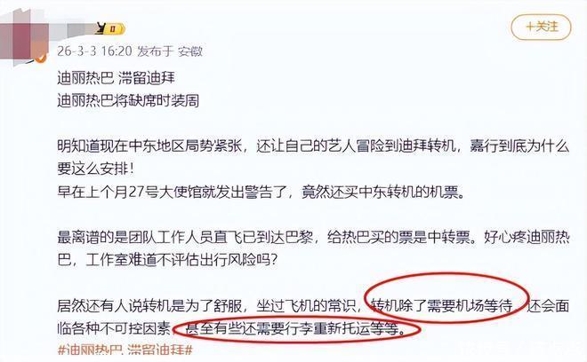 也正是此趟不合时宜的转机安排,直接让迪丽热巴在3月1日开始,就因为战乱问题被迫滞留在中东。